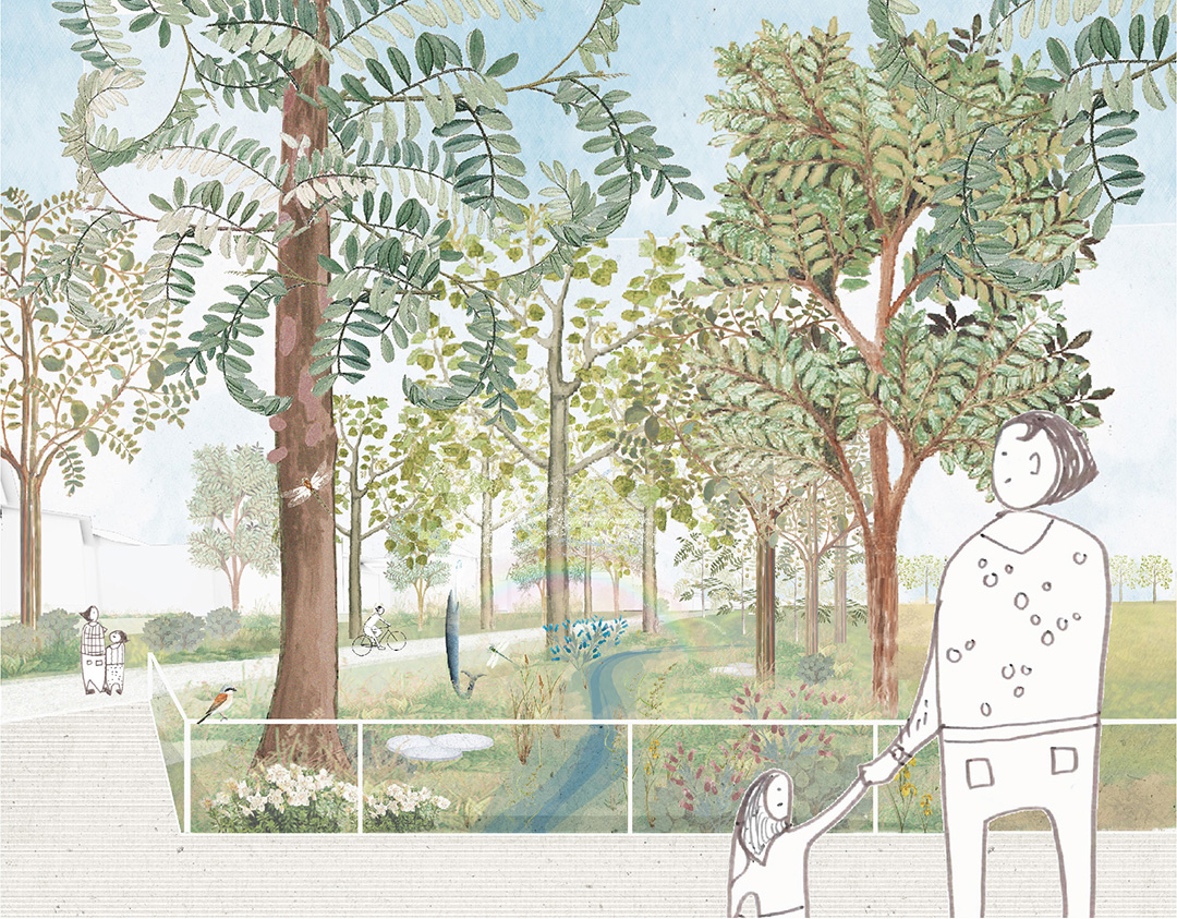 The team of Studio Céline Baumann with NRP Ingenieure, OePlan, Schneiter Verkehrsplanung and Soziologie & Raum wins first prize for the revitalisation of the Mattenbach river. Stretching for more than two kilometers, the project allows the nowadays canalized stream to become the heart of a new recreational and ecological landscape. By carefully highlighting traces of history and gently redirecting the stream, it transforms the former riverbed into a shaded promenade, where the trees of the alluvial forest create a continuous, living corridor.