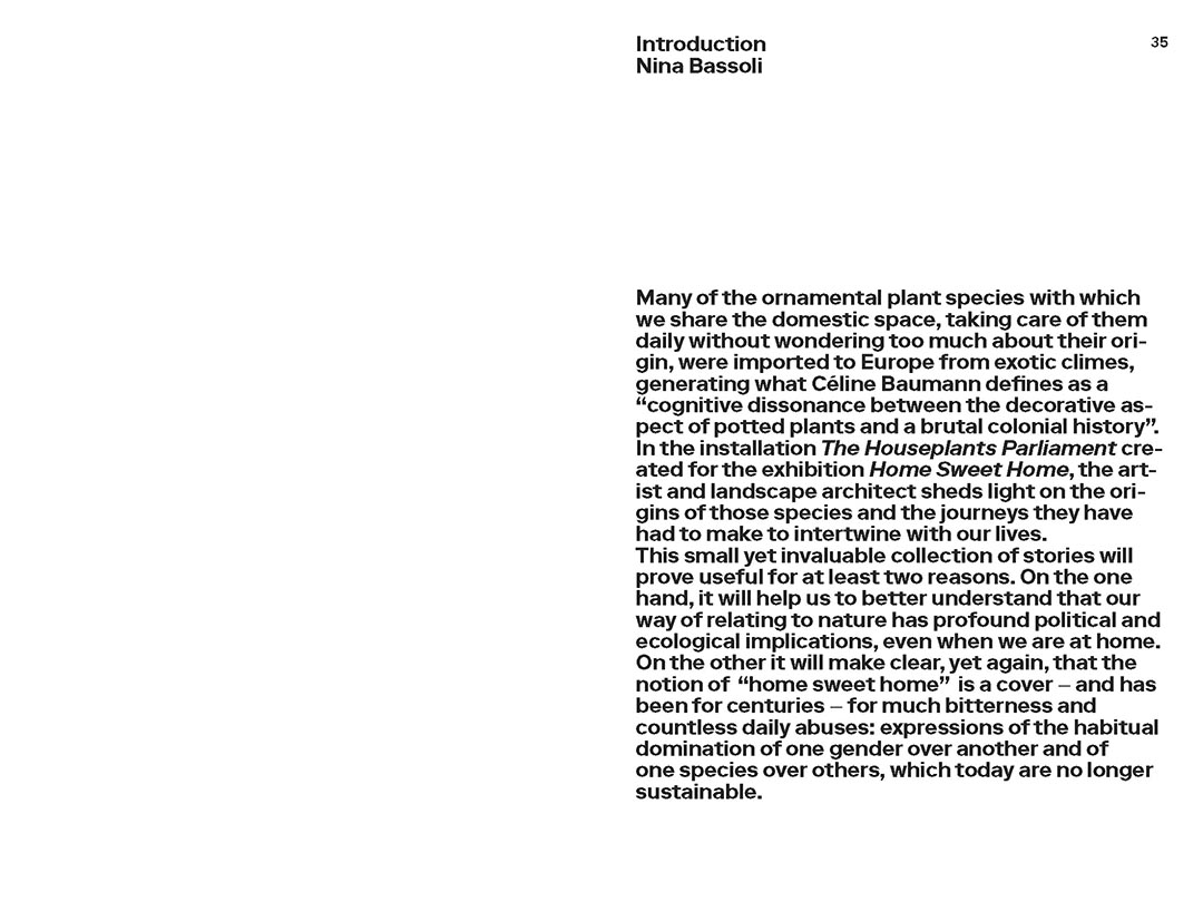 Many of the ornamental plant species with which we share the domestic space, taking care of them daily without wondering too much about their origin, were imported to Europe from exotic climes, generating what Céline Baumann defines as a “cognitive dissonance between the decorative aspect of potted plants and a brutal colonial history”. The installation sheds light on the origins of those species and the journeys they have had to make to intertwine with our lives and will prove useful for at least two reasons. On the one hand, it will help us to better understand that our way of relating to nature has profound political and ecological implications, even when we are at home. On the other it will make clear, yet again, that the notion of “home sweet home” is a cover – and has been for centuries – for much bitterness and countless daily abuses: expressions of the habitual domination of one gender over another and of one species over others, which today are no longer sustainable.
