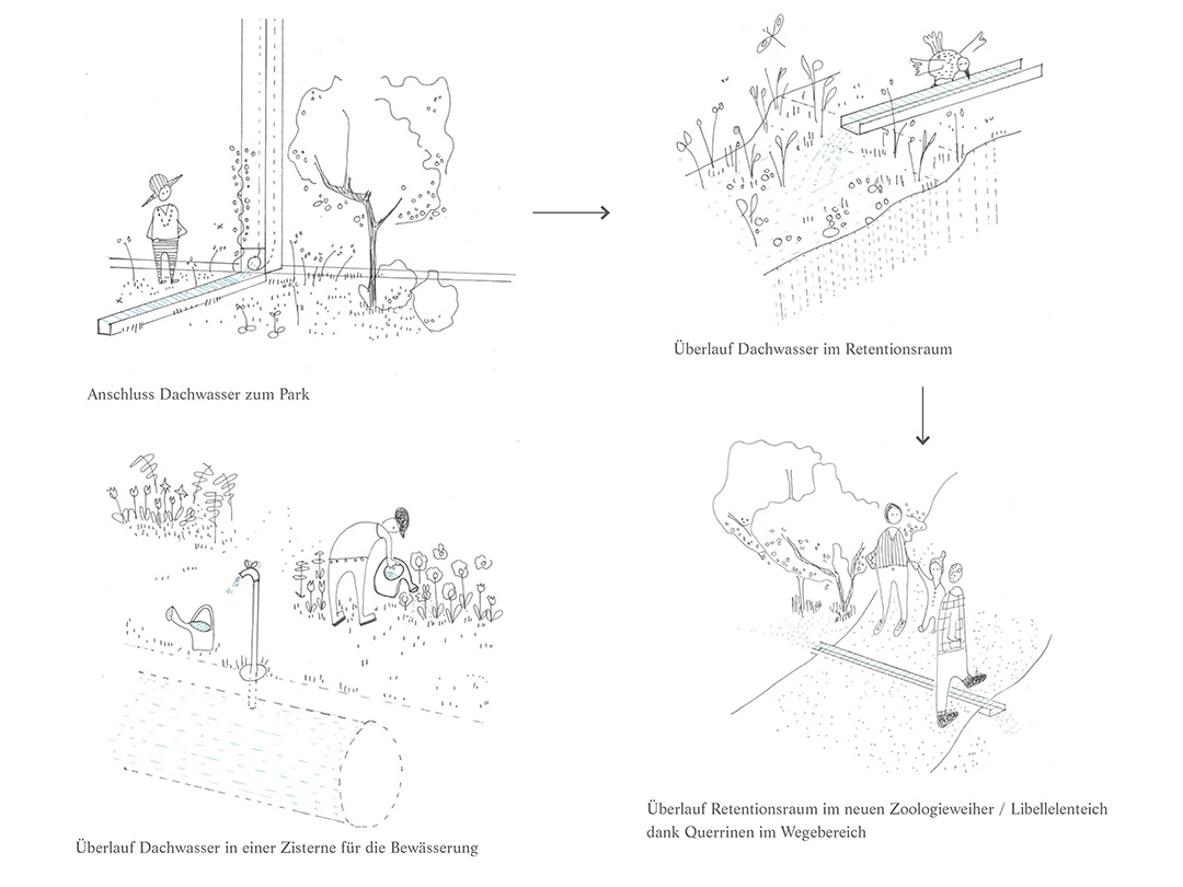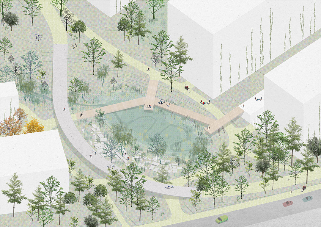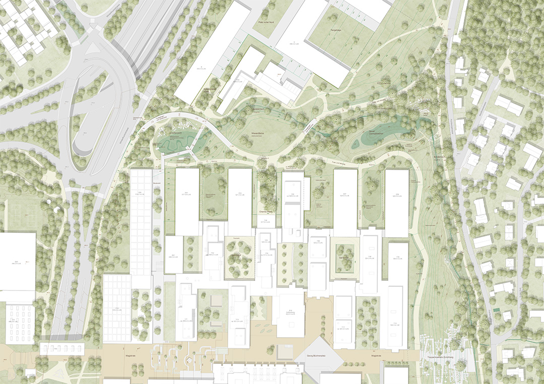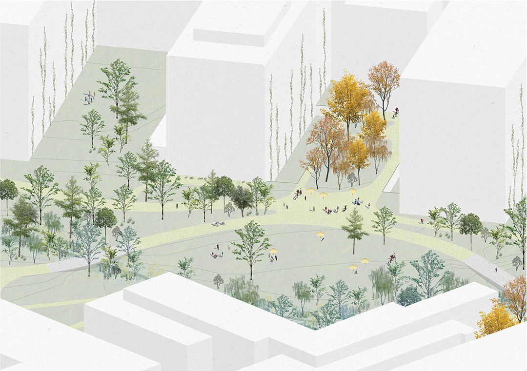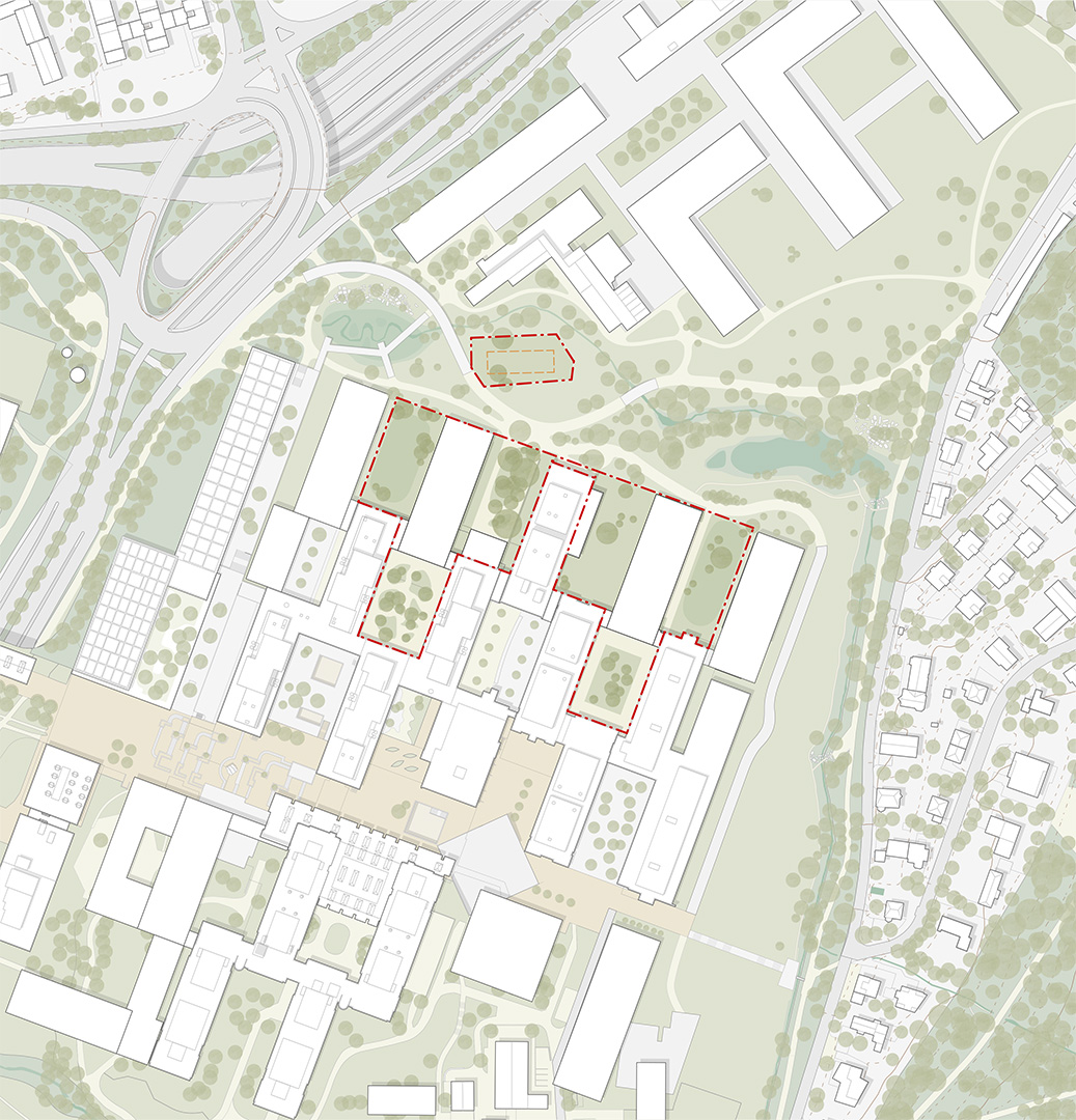 ENG The present competition entry pays tribute to the winning design submitted in 1978 by Atelier Stern und Partner in collaboration with Eduard Neuenschwander. It takes inspiration from the history of Irchelpark and ties in closely with both the surrounding landscape and the nearby neighbourhoods. Five distinct landscape typologies are developed in order to create a rich and varied park landscape: several forest fingers, one central meadow, a wet landscape composed of a river and a dragonfly pond, two lively squares and linear vertical gardens. Within the forest fingers, oak and hornbeam trees form a quieter woodland community near the zoological pond to the east. They reach out from the Zürichberg woods into the new park, while on the sunny slope along Winterthurerstrasse, a pine forest is being shaped. At the heart of the park lies the central meadow—an open, sunlit space of grasslands. Framed by the forest fingers on one side and the new buildings on the other side, it acts as the park’s central stage. Next to the meadow flows the Spitalerbach stream freely across the site, feeding the zoological pond before winding its way through the dragonfly pond. The latest pond changes throughout the year, sometimes appearing as a shimmering pool, other times as a damp, meadow-like basin. Next to the new buildings, two lively squares mark the thresholds between the park and the campus. Here, shaded by large trees, people can sit, meet, or enjoy a meal outdoors, in spaces that balance the bustle of the university with the calm of the park. Vertical gardens composed of climbing plants grow on the eastern and western facades of the new buildings, blurring the line between architecture and landscape. With hardy, soil-rooted, and species-rich plantings, the climbers bring nature right up onto the faculty buildings upper floors.