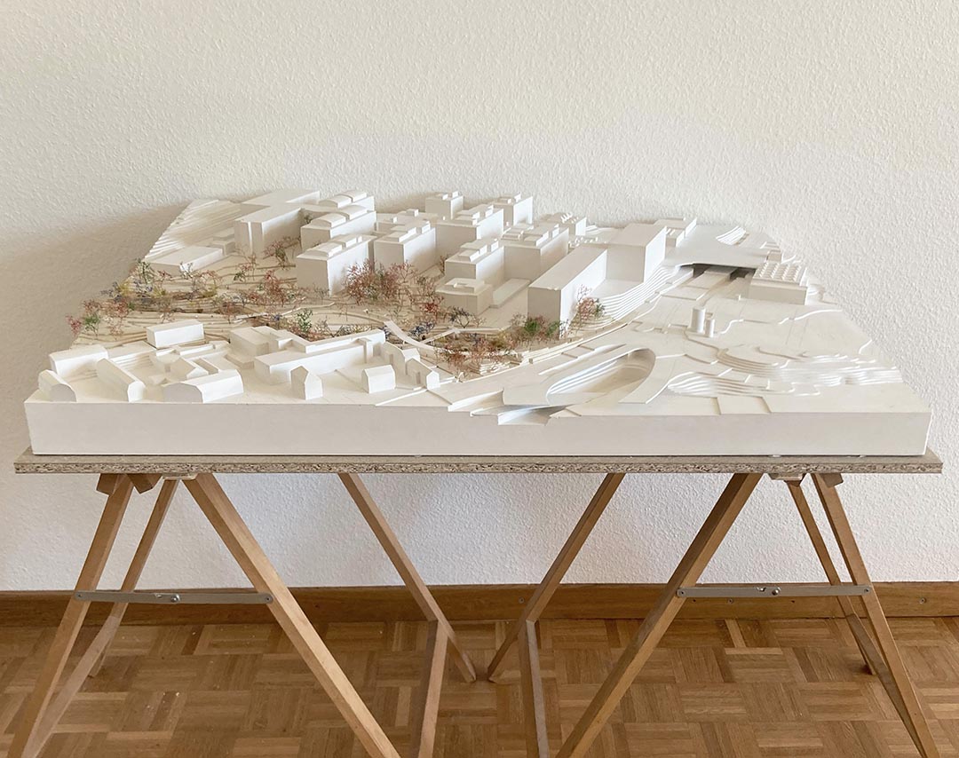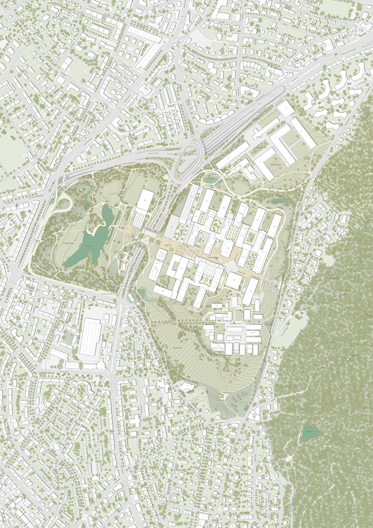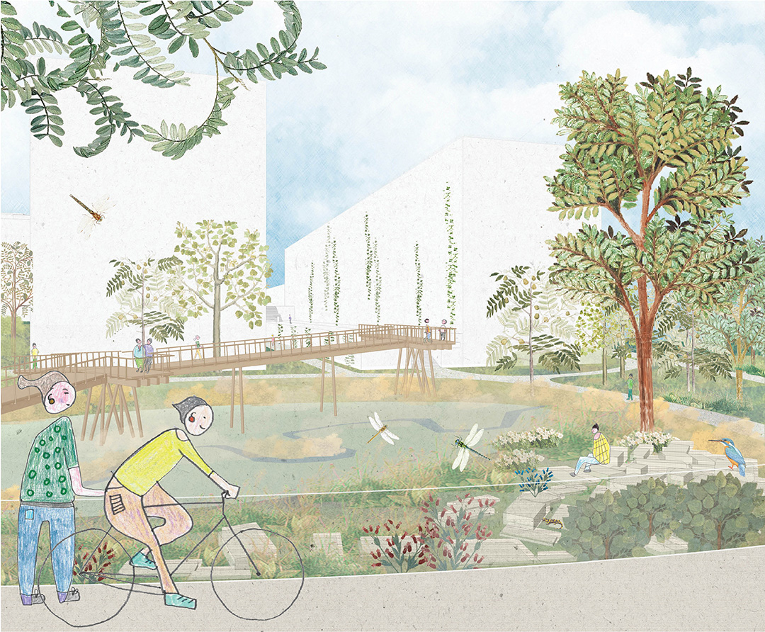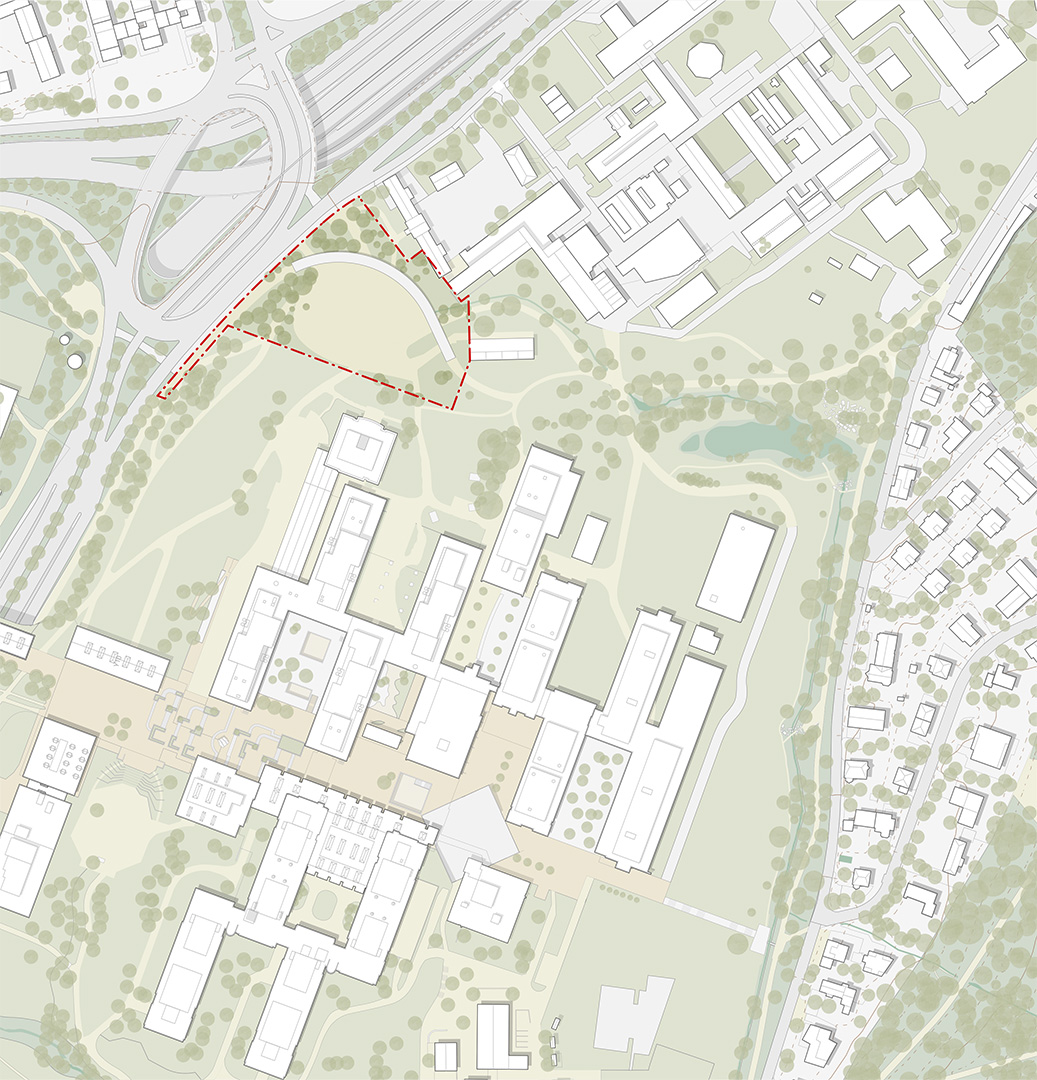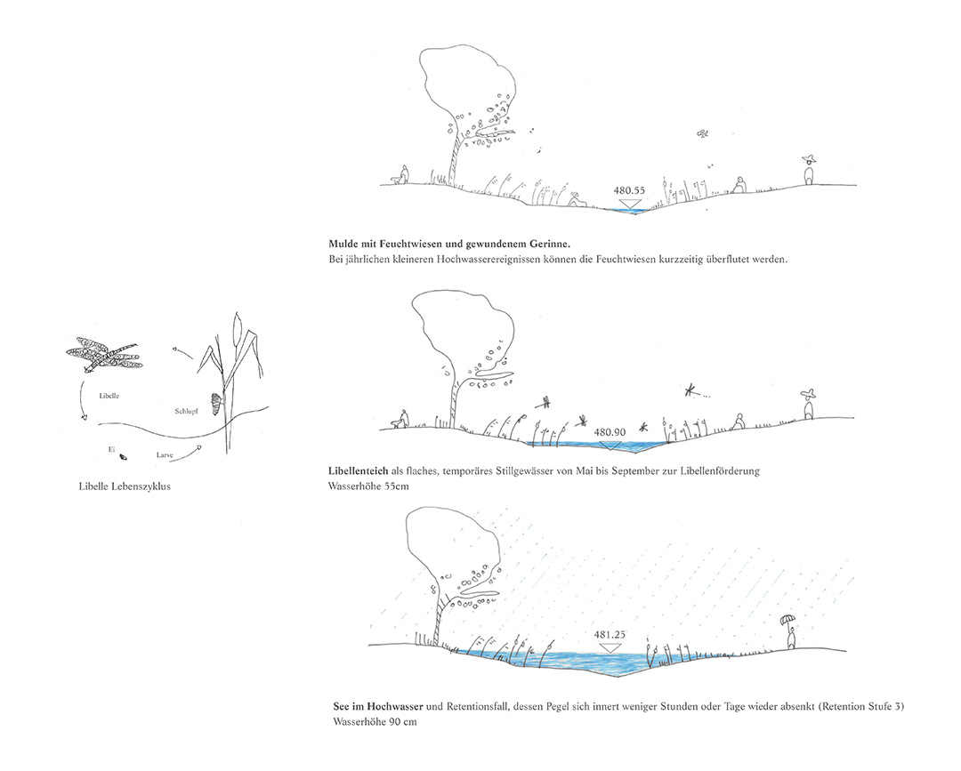 ENG The present competition entry pays tribute to the winning design submitted in 1978 by Atelier Stern und Partner in collaboration with Eduard Neuenschwander. It takes inspiration from the history of Irchelpark and ties in closely with both the surrounding landscape and the nearby neighbourhoods. Five distinct landscape typologies are developed in order to create a rich and varied park landscape: several forest fingers, one central meadow, a wet landscape composed of a river and a dragonfly pond, two lively squares and linear vertical gardens. Within the forest fingers, oak and hornbeam trees form a quieter woodland community near the zoological pond to the east. They reach out from the Zürichberg woods into the new park, while on the sunny slope along Winterthurerstrasse, a pine forest is being shaped. At the heart of the park lies the central meadow—an open, sunlit space of grasslands. Framed by the forest fingers on one side and the new buildings on the other side, it acts as the park’s central stage. Next to the meadow flows the Spitalerbach stream freely across the site, feeding the zoological pond before winding its way through the dragonfly pond. The latest pond changes throughout the year, sometimes appearing as a shimmering pool, other times as a damp, meadow-like basin. Next to the new buildings, two lively squares mark the thresholds between the park and the campus. Here, shaded by large trees, people can sit, meet, or enjoy a meal outdoors, in spaces that balance the bustle of the university with the calm of the park. Vertical gardens composed of climbing plants grow on the eastern and western facades of the new buildings, blurring the line between architecture and landscape. With hardy, soil-rooted, and species-rich plantings, the climbers bring nature right up onto the faculty buildings upper floors.