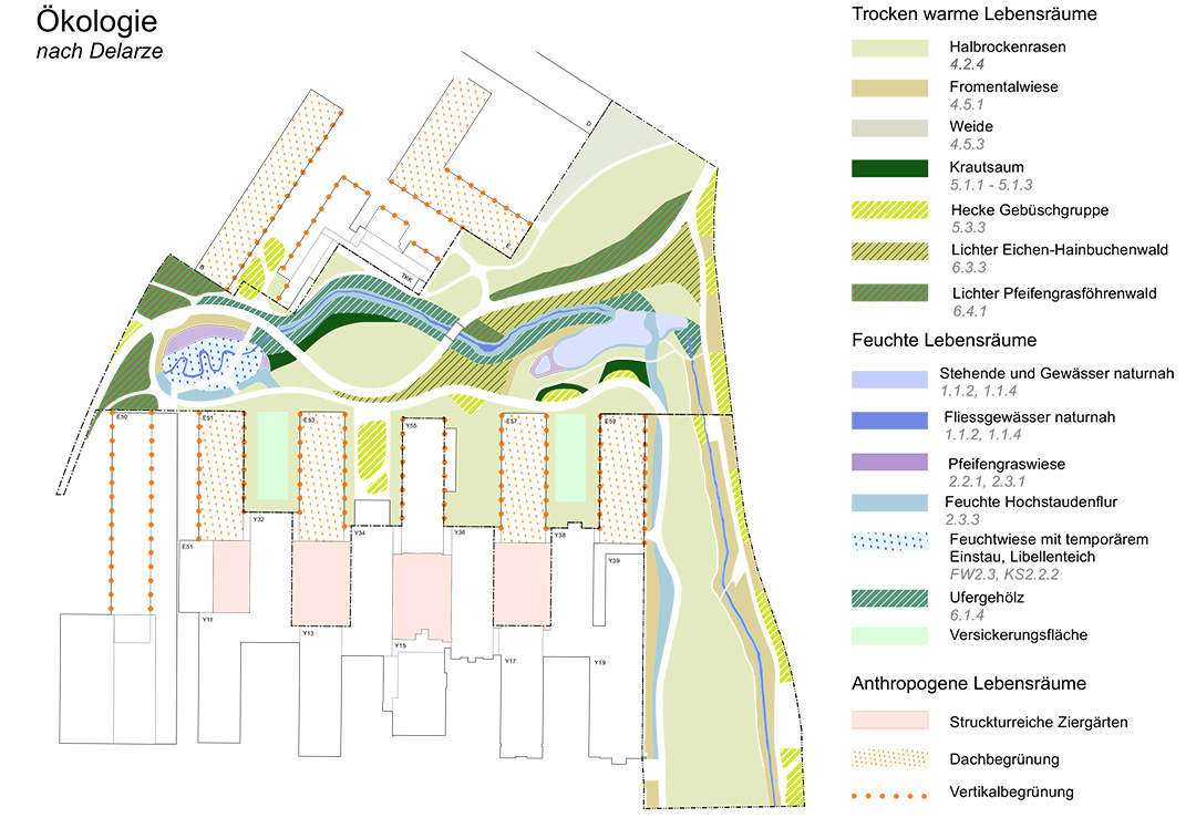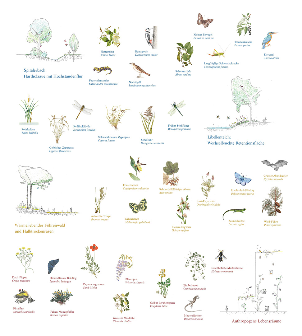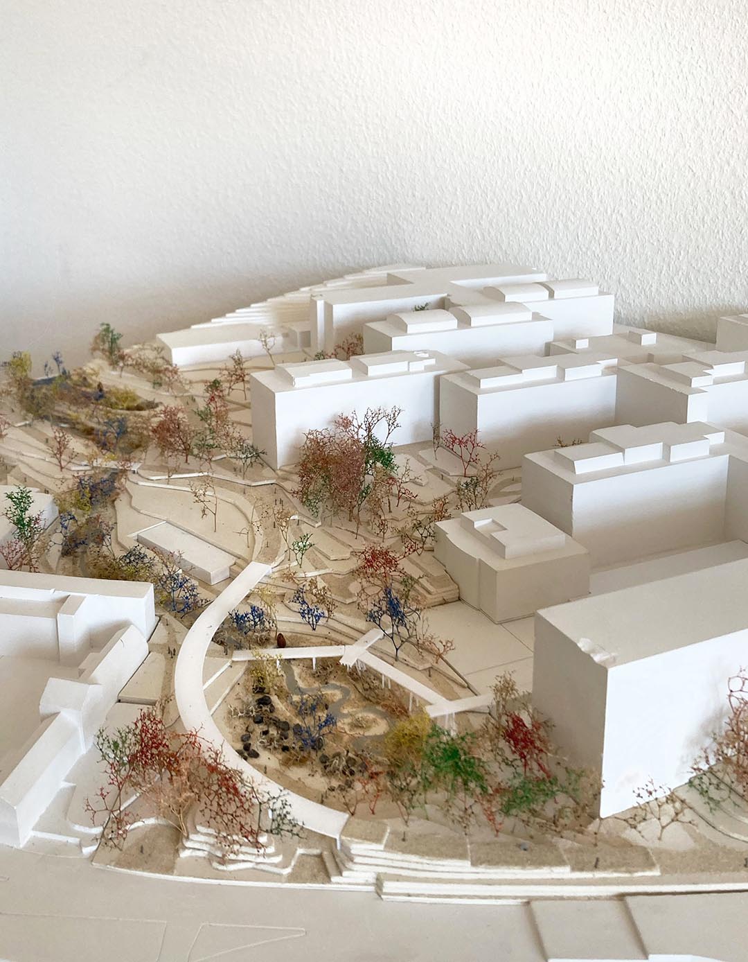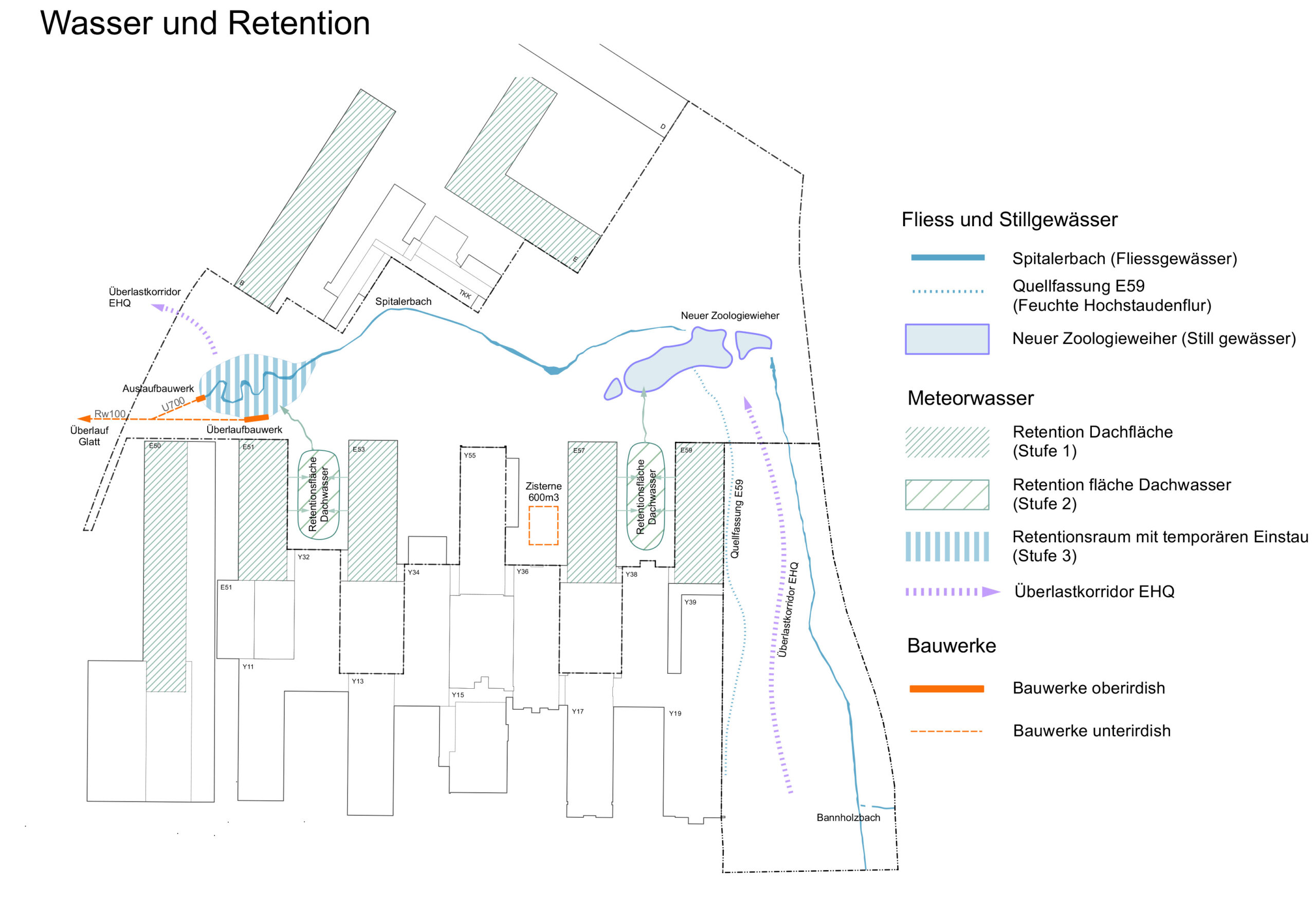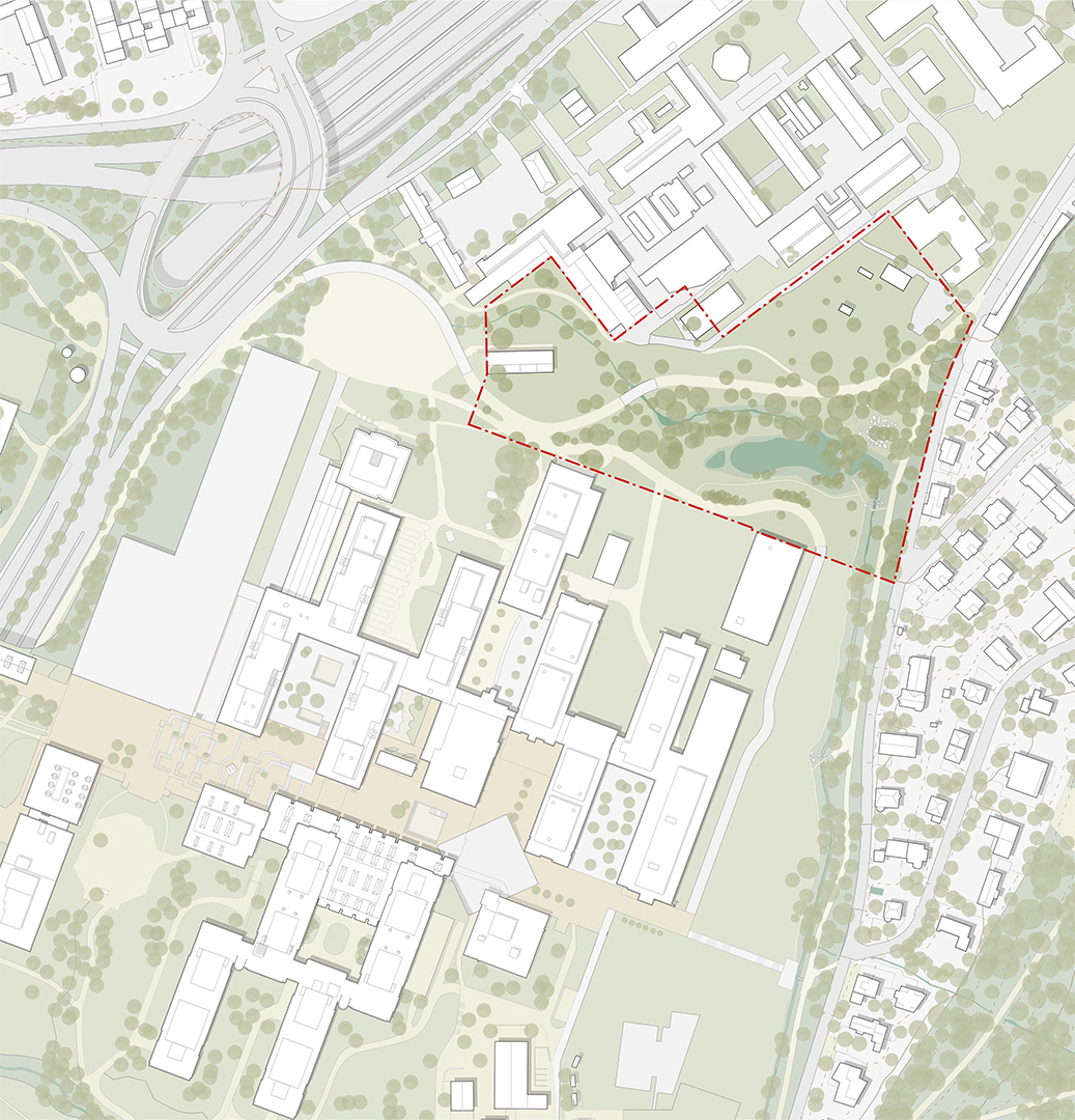 Der offengelegte Spitalerbach durchzieht das Gelände, speist den Zoologieweiher und mäandriert durch den Libellenteich. Dieser dient als wechselfeuchte Retentionsfläche und zeigt im Jahresverlauf stets ein wandelbares Bild. An den Ost- und Westfassaden der Neubauten wachsen vertikale Gärten. Sie bilden das Bindeglied zwischen Architektur und Landschaft und lassen den Park in den Campus hineinwachsen. Eine robuste, bodengebundene Bepflanzung mit hoher Artenvielfalt gewährleistet gesundes Wachstum bei geringem Pflegeaufwand. Schliesslich leiten zwei Plätze den Übergang von der offenen Landschaft zum belebten Campus ein: der Kleintierklinik-Platz und der Chemie-Platz. Sie vermitteln zwischen der hohen Nutzungsdichte des Gebäudeumfelds und der Ruhe des Parks. Schatten grosser Bäume, Sitzgelegenheiten und Flächen für Aussengastronomie machen sie zu lebendigen Aufenthaltsorten.