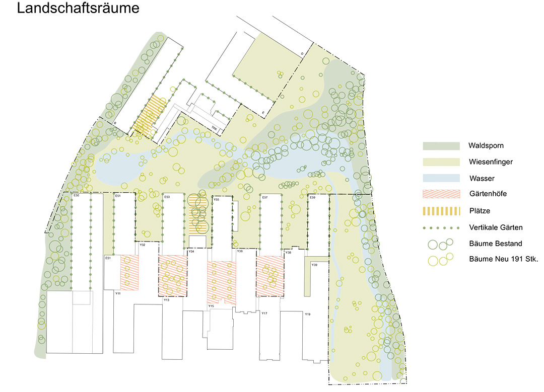 DE Die historische Gestaltung des Irchelparks liefert die konzeptionellen Leitlinien für die Neugestaltung des Übergangsbereichs IrchelNord. Fünf charakteristische Landschaftsräume fügen sich zu einem vielfältigen Parkensemble: die Waldsporne, die zentrale Wiese, der Libellenteich, die vertikalen Gärten sowie zwei neue Plätze. Die Waldsporne verbinden den bestehenden Irchelpark mit den Wäldern des Zürichbergs. Unter Berücksichtigung der Standortbedingungen entstehen unterschiedliche Waldgesellschaften: an der sonnigen Hangkante entlang der Winterthurerstrasse ein lichter Föhrenwald, im Osten rund um den Zoologieweiher eine Eichen-Hainbuchen-Gesellschaft. Aus dieser bewaldeten Rahmung öffnet sich die zentrale Wiese als verbindendes Herzstück. Magere Trockenwiesen- und Rasengesellschaften schaffen eine offene Mitte, eingefasst von Waldspornen und Bebauung. Im Endzustand greifen lange Wiesenarme bis zwischen die Neubauten hinein.